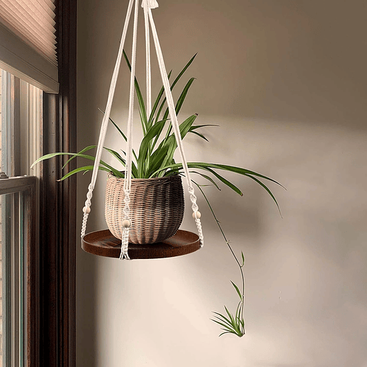 ✔️ Contenido: 2 soportes colgantes de macramé con base de madera aceitada y bandeja resistente de 0.9" de profundidad, ideales para macetas de interior y pequeñas colecciones.