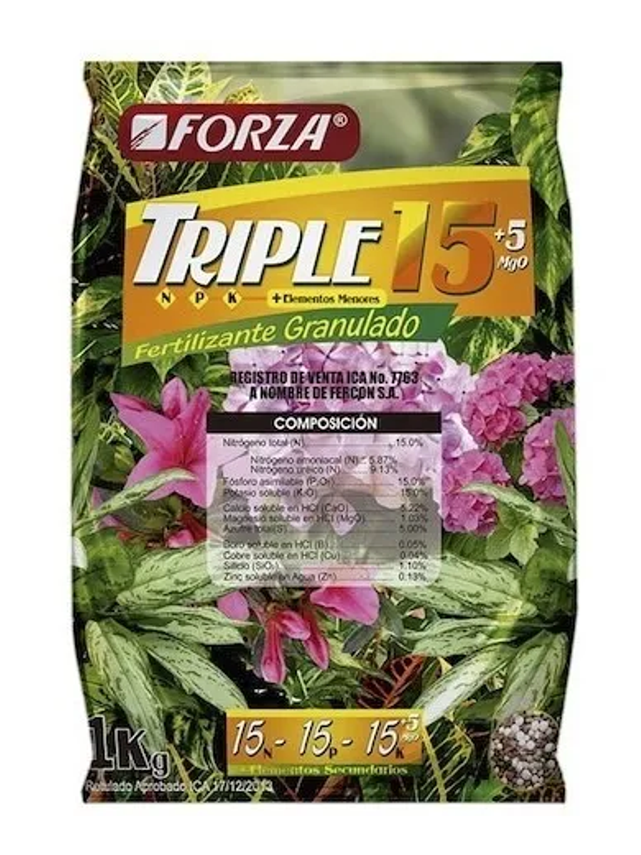 Forza Triple 15, es un fertilizante complejo multipropósito de liberación controlada. Fuente óptima de los tres macronutrientes esenciales como son: Nitrógeno (N), Fósforo (P) y Potasio (K). El nitrogeno estimula el crecimiento de hojas y ramas, el fosforo estimula el crecimiento de raíces y la floración y el potasio es esencial para el llenado de frutos y semillas. 🌿