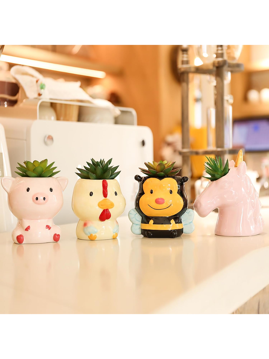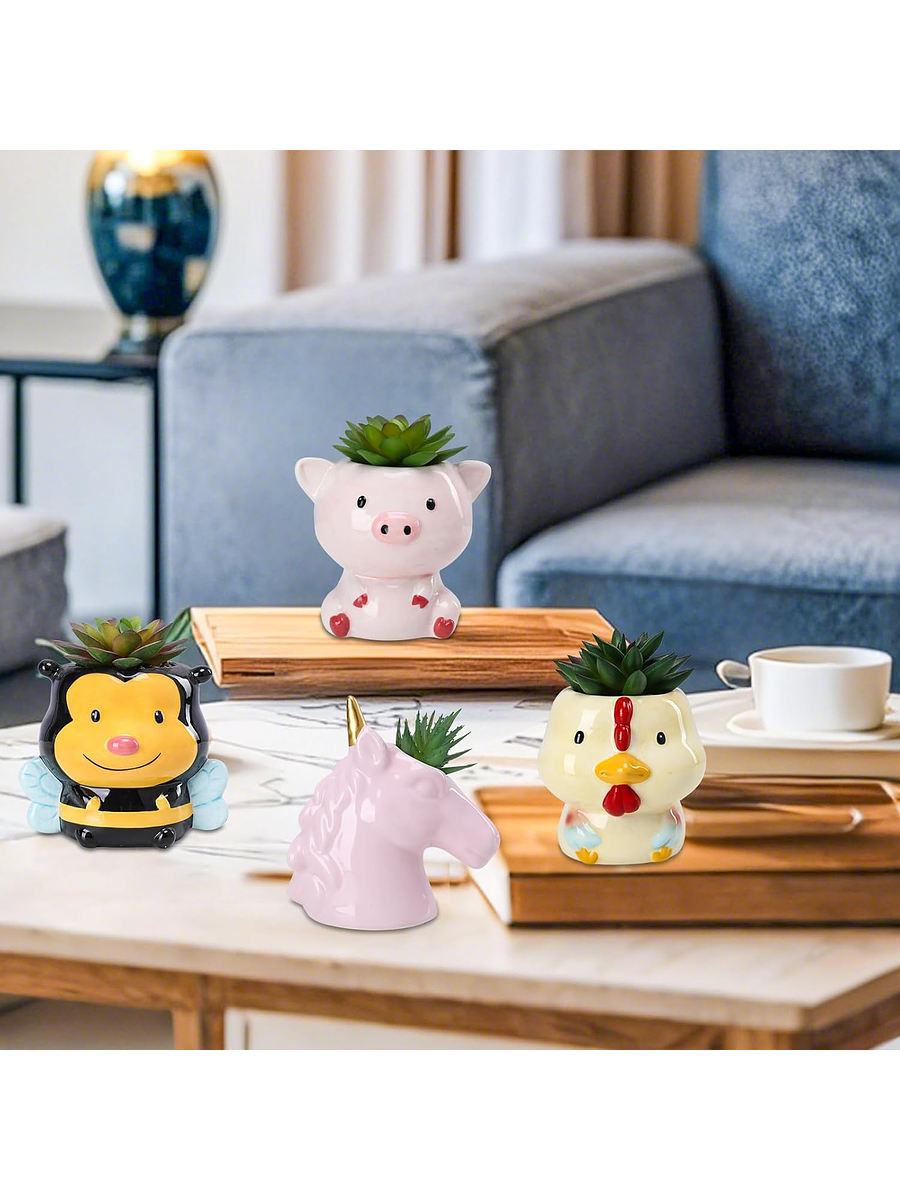 Este adorable juego incluye macetas de cerámica pintadas a mano con encantadoras formas de animales como unicornio, cerdo, pollo y abeja, cada una luce un acabado esmaltado brillante que resiste la decoloración y añade un toque divertido a escritorios o estanterías. 🦄🐷🐔🐝