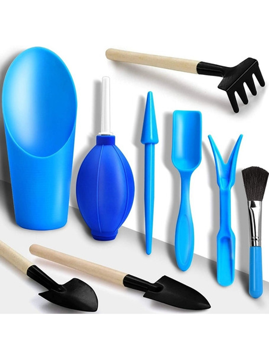Contenido del set: 2 herramientas de trasplante, 1 cepillo para limpieza, 1 soplador de aire, 3 herramientas mini (pala, rastrillo y palita), 2 palas tipo cubo.