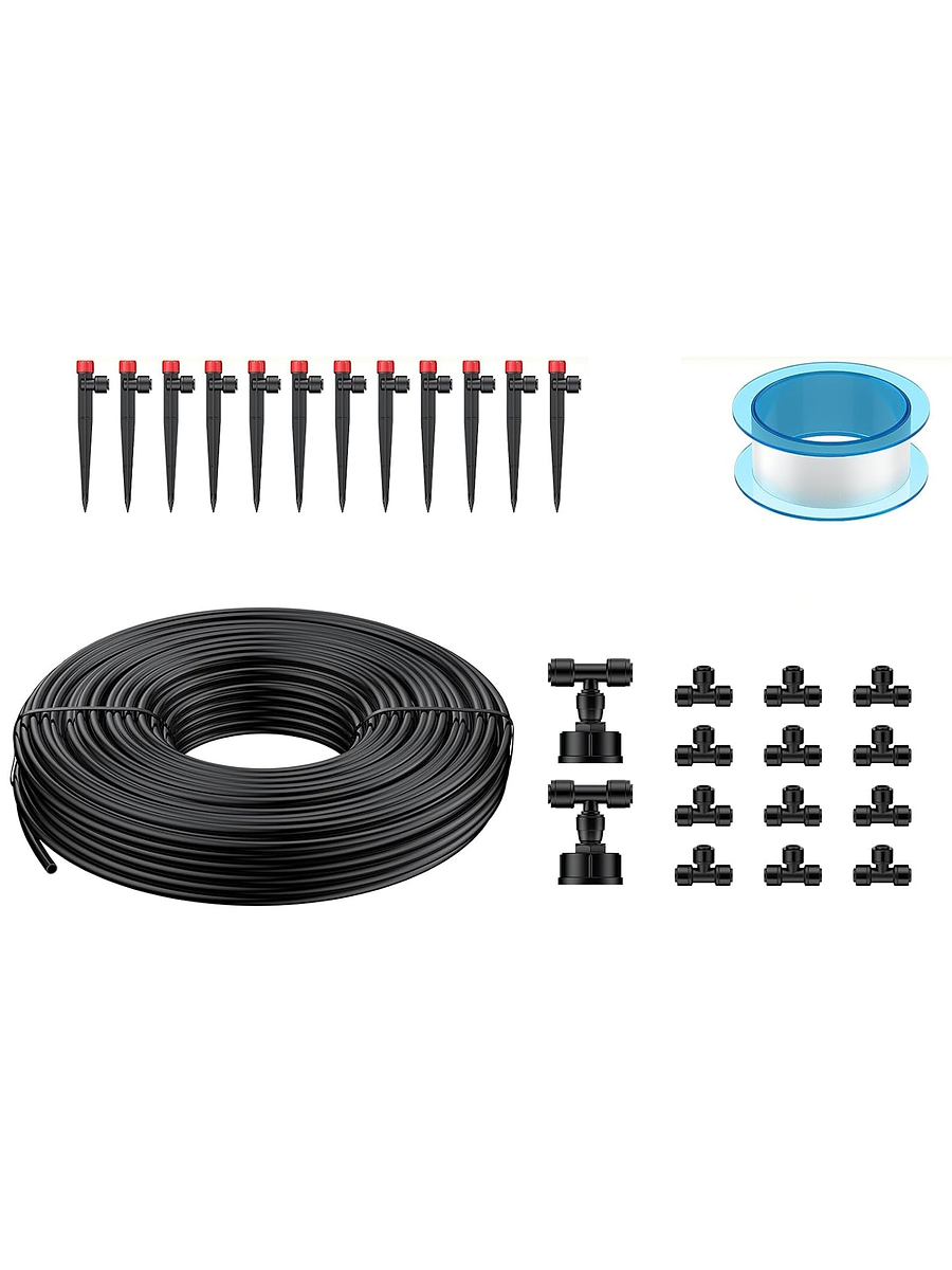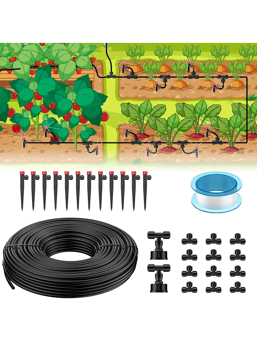 Riega de forma eficiente y sin complicaciones con este kit de sistema de riego por goteo de 15 metros, ideal para jardines, huertos, bancales elevados, patios o invernaderos, incluye todo lo necesario para montar o ampliar tu sistema de riego: Manguera resistente a rayos UV, 12 aspersores ajustables con caudal regulable, conectores en T de alta resistencia y accesorios de conexión rápida para grifos.