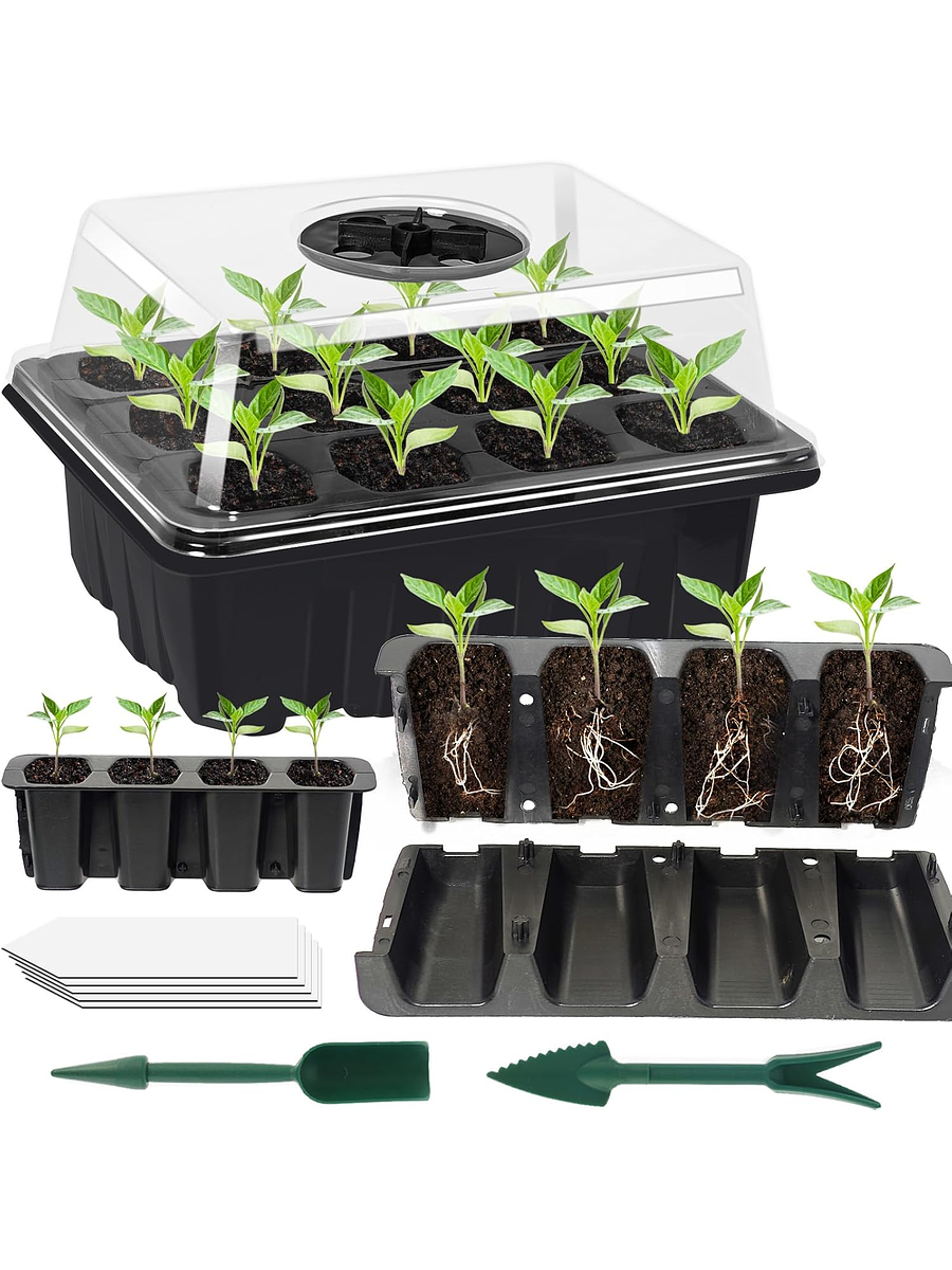 Este kit completo incluye 3 bandejas de semillas con separadores transparentes que permiten observar el crecimiento sin interrumpir el proceso. Los grandes agujeros de drenaje favorecen la aireación de las raíces y facilitan el trasplante de las plántulas.