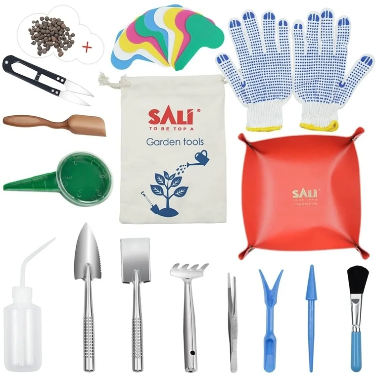 Este completo kit incluye todo lo esencial para el cuidado de tus plantas suculentas y cactus: 1 botella de agua (8.5 fl oz), 1 cepillo de limpieza, 1 par de pinzas de punta recta, 1 recortadora de hojas, 2 herramientas de trasplante, Alfombrilla de lona para trasplante, 1 pala, Juego mini de herramientas de madera (pala ancha, mini pala y mini rastrillo), Juego de herramientas de acero inoxidable (pala ancha, pala y rastrillo), 1 bolsa organizadora, 2 guantes, 10 etiquetas para plantas, Sembradora de jardín, 1 bolsa de tierra negra para macetas con roca de lava. 🌵
