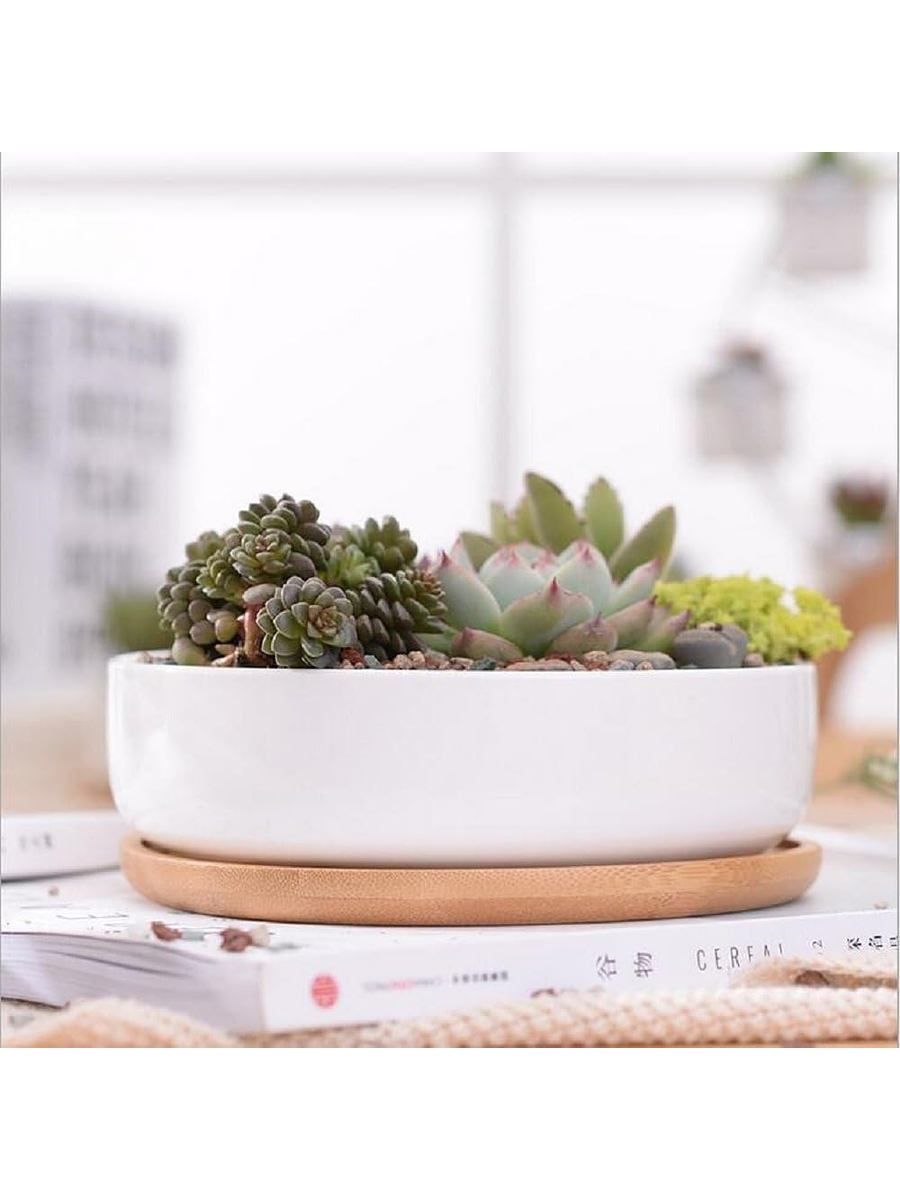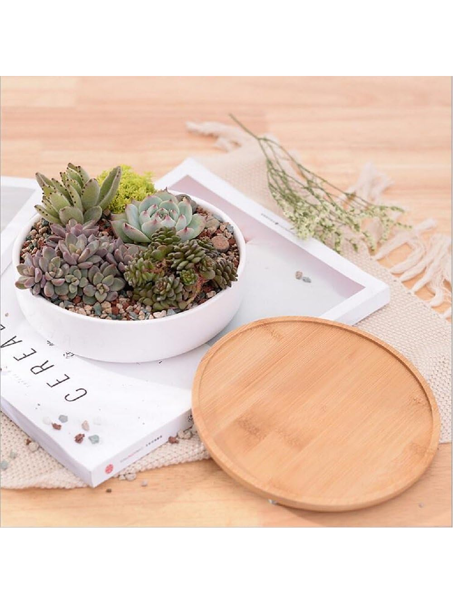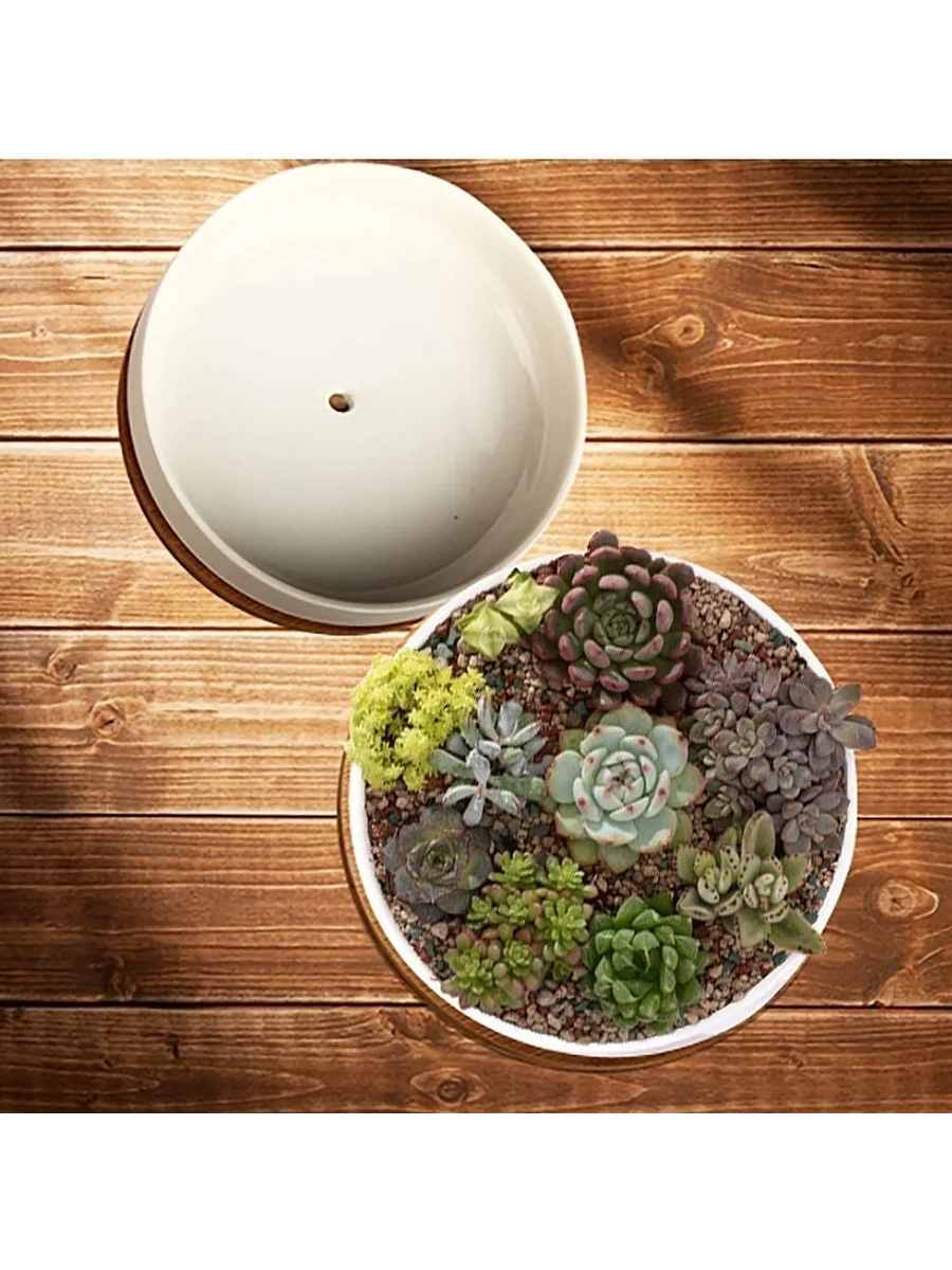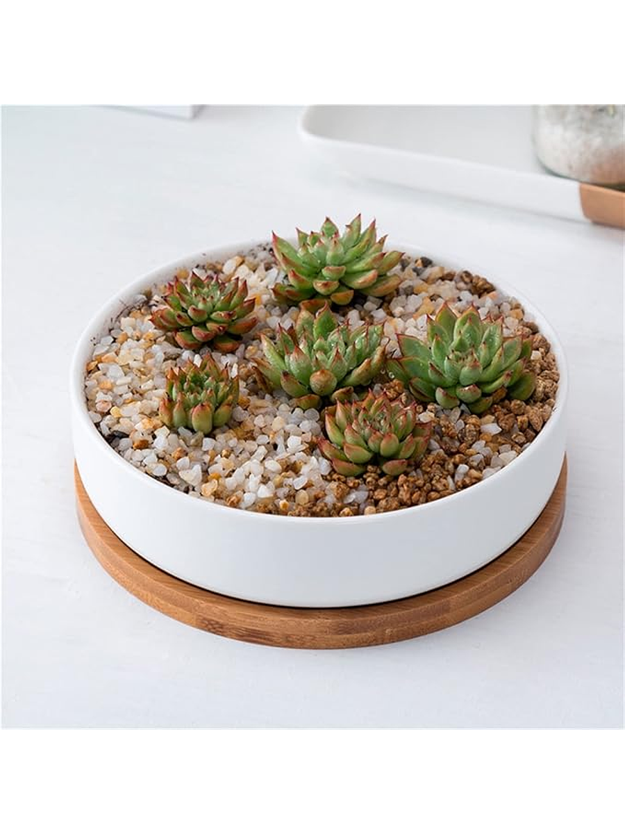 Maceta En Cerámica Suculentas Redonda Más plato En Bambú Premium