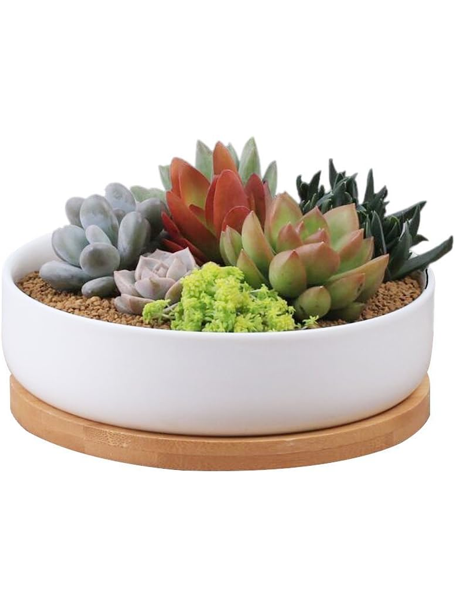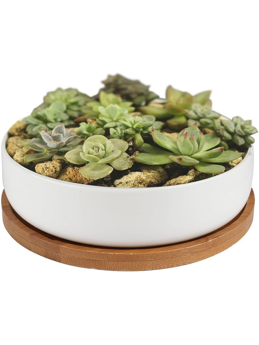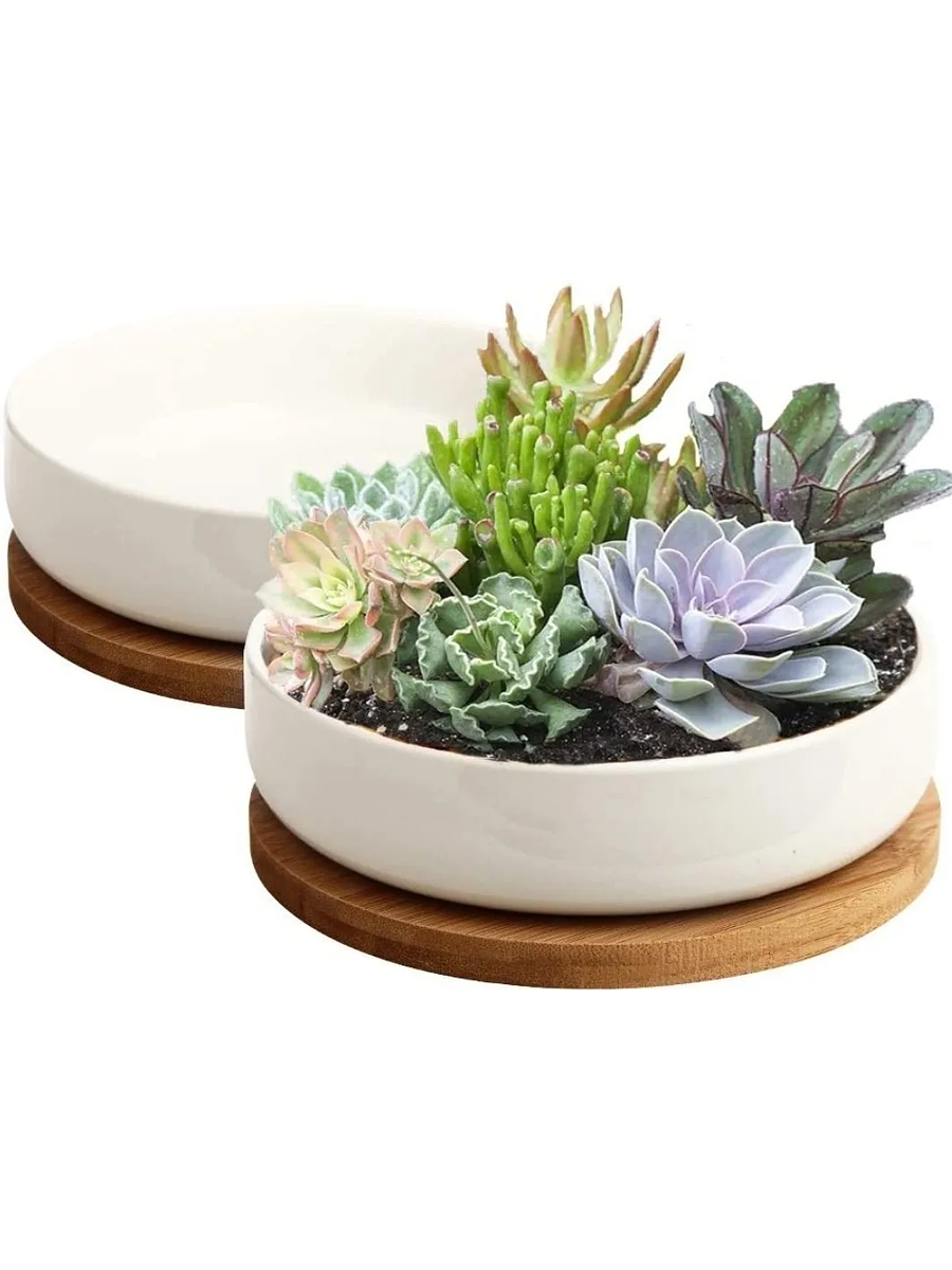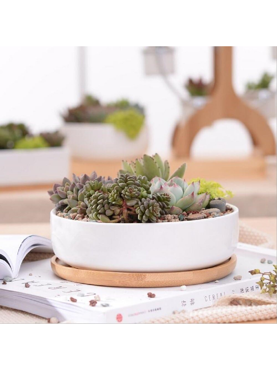 Maceta En Cerámica Suculentas Redonda Más plato En Bambú Premium