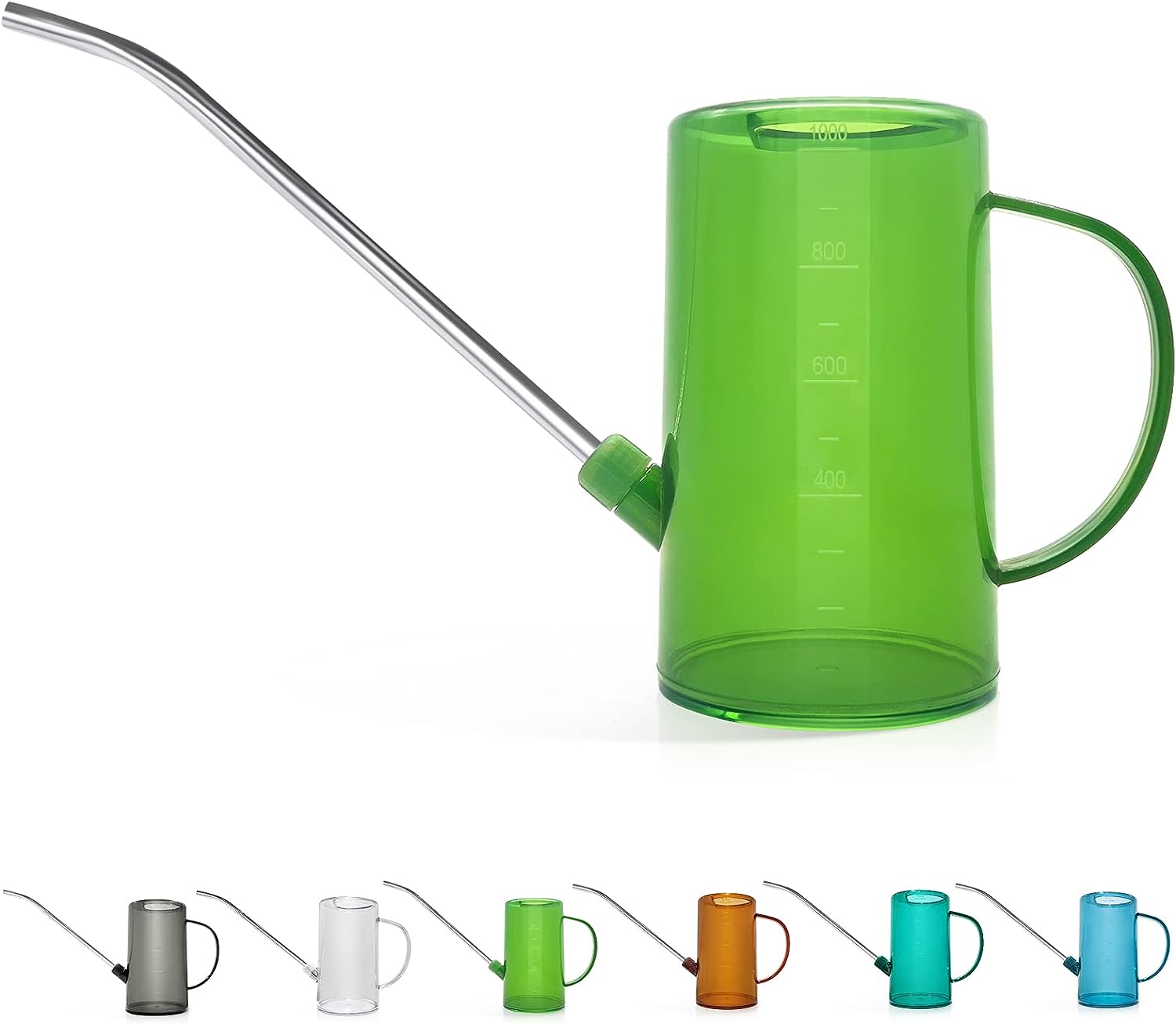El cuerpo de la regadera es transparente y cuenta con marcas de medición, lo que permite controlar fácilmente el nivel de agua y mantenerla limpia, su mango ergonómico curvado y diseño liviano hacen que verter el agua sea cómodo y seguro, con una capacidad total de 1 litro.