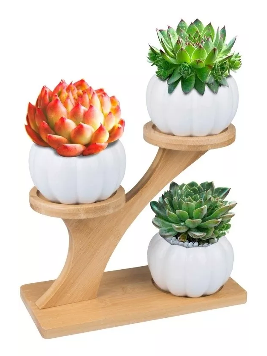 Soporte en Bambu más Macetas Cerámica x3 Premium de Plantas